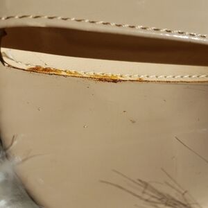 minor indentations on right heel, not really noticible. Minor discoloration on back zipper that may come off. Minor discolor on left insole.