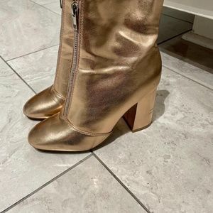 Shoes are in great condition. There's a couple of scuffs on the heel but the bottoms look like they have only been walked on a couple times. 3.5" heel and 7" shaft from arch to top. They're "rose gold" but in person they're definitely gold.