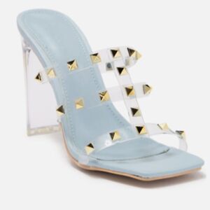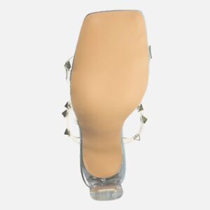 Pyramid studs adorn this clear T-strap sandal lofted on a clear heel for chic style.