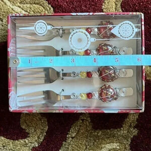 4 Wild Eye Designs NWT cocktail, 3 prong forks with beads and curved silver tone design. Each piece is unique as they are handcrafted. Stainless. Hand wash only. 4 forks to a box.