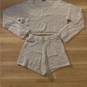 Includes a long sleeve cropped sweater and high-waisted shorts.