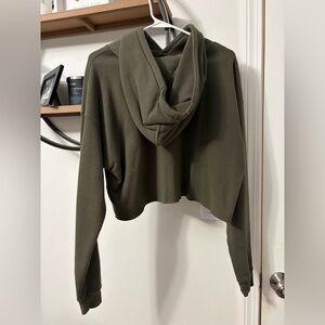 Chic cropped hoodie in army green. Features drawstring hood. Ideal for layering.