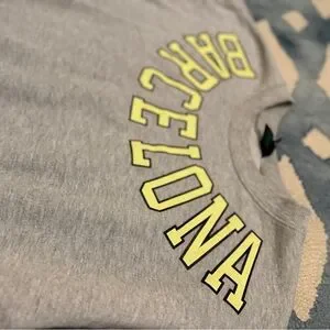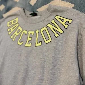Classic grey crewneck sweatshirt. Bold yellow "BARCELONA" text across the chest. Soft, casual style. Easy to pair with jeans or leggings.