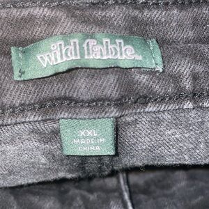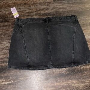 Chic black denim mini skirt. Features stylish stud accents. Ideal for a modern look.