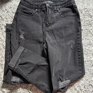 Trendy black boyfriend jeans with distressed details. Relaxed fit for casual style.