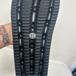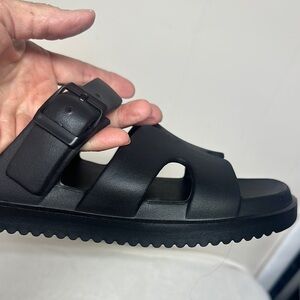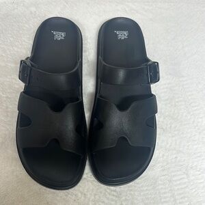 Embrace simplicity with Wild Fable's black sandals, designed with wide strap bands for a snug fit. Made from durable synthetic material, these sandals offer a sleek, casual look perfect for everyday wear. The flat sole ensures comfort and ease with every step. See all photos as they are part of description
