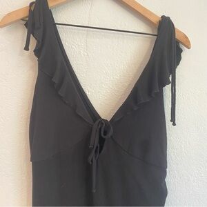 Chic black mini dress. Features ruffle details. Adjustable shoulder ties. Perfect for any occasion.