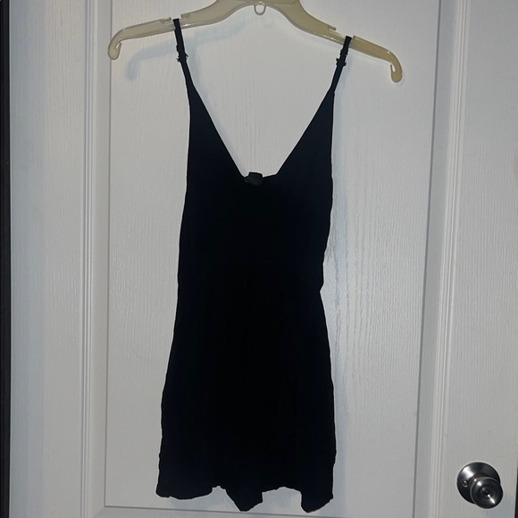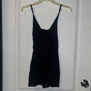 Chic black rudfle romper by Wild Fable. Features adjustable straps and pockets. Perfect for layering or wearing alone.