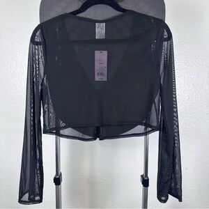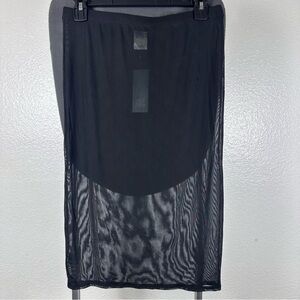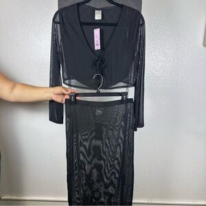 Chic black sheer ensemble. Features a long-sleeve top and matching skirt. Ideal for evening wear.