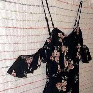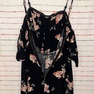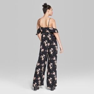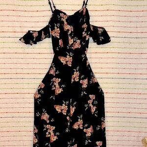 Wild Fable Black cold-shoulder jumpsuit with allover floral pattern. Made from 100% rayon with a wide-leg silhouette and cinched waistline. Completed with flutter sleeves and a half button-down front. Zipper on back runs to under waist. Very good condition. True to size. Pet and smoke free home