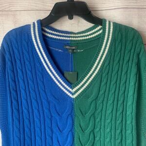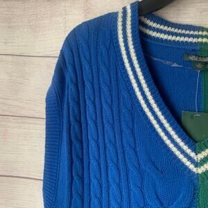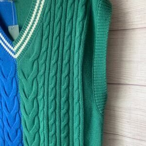 Blue and green knit sweater vest by Wild Fable. This vest has a v-neckline and is sleeveless. The neckline and bottom band have white stripes. The sleeve cuffs, neckline, and bottom band are all ribbed. The front of the vest has a striped cable knit pattern. It is NEW, with tags. XS but fits oversized and large (see measurements).