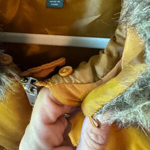 Wild Fable bomber-style gold puffer coat jacket with faux fur removable neck cover. Has two front button pockets and gold zipper detailing