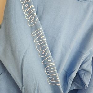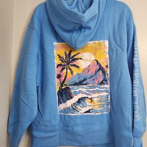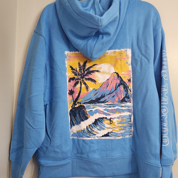 Casual blue hoodie with front pocket. Features 'Coastal Surf' text on sleeve. Ideal for everyday wear.