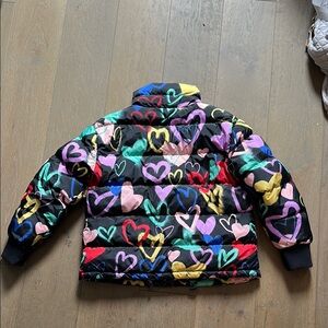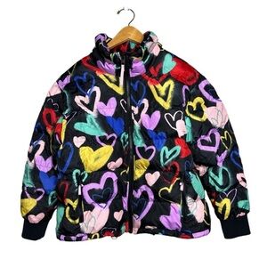 Vibrant puffer jacket with a playful heart pattern. Features a mix of colors including red, pink, yellow, and blue. Perfect for adding a pop of color to your outfit. Warm and cozy, great condition, smoke and pet free home.
