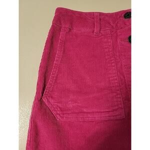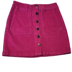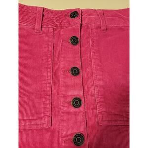 Deep pink corduroy skirt with a front button closure and oversized patch pockets. Stretch cotton blend for comfort. Great statement piece for bold everyday looks.