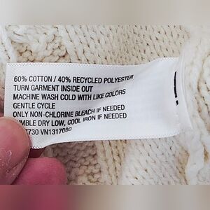 Cozy cream cropped cable knit sweater. Scooped wide neckline. The hem of the sweater is a bit shorter in front than back, as shown in images.