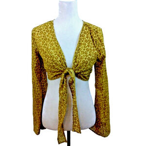 Womens Crop Top Yellow Long Sleeve Floral Knot Tie Festival