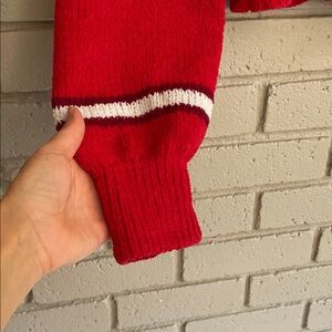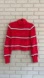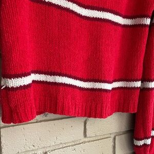 Bold cropped red sweater with white stripes. Features a cozy turtleneck design. Perfect sweater for fall and the holidays.