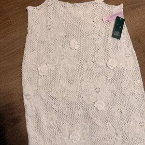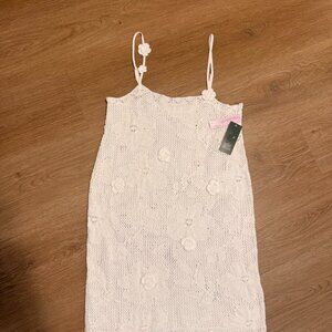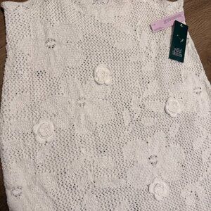 Women's Rosette Mini Sweater Dress Off-white Floral Cotton, Backless, Pullover, Sleeveless, Pointelle