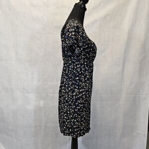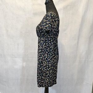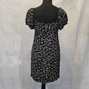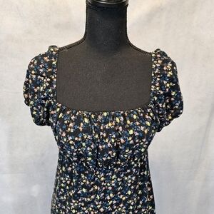 Black Floral pullover dress with red, teal, yellow flowers, slightly puffy sleeves that can be worn pulled up or hung off shoulders. Size XS