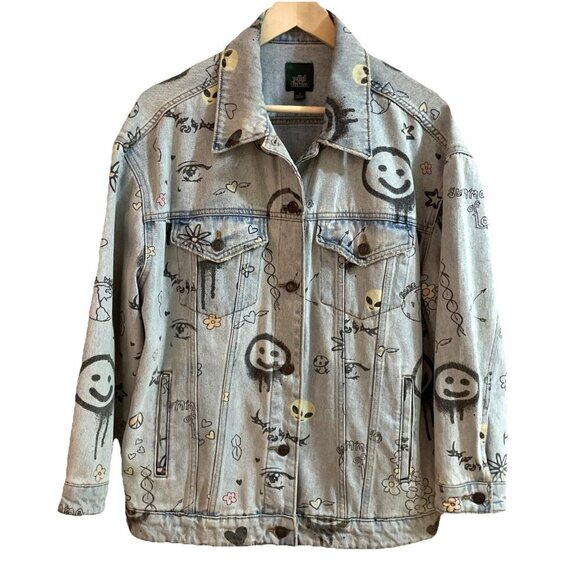 Wild Fable Graffiti Jean Jacket Women's L Denim Alien Smiley Face Flower Grunge