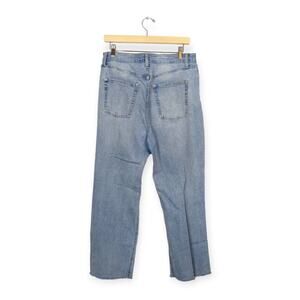 Wild Fable Highest Rise Straight Leg Distressed Jeans. High-waisted jeans cut in a straight-fit silhouette. Fashioned in a medium wash with distressed detailing on both legs, and a raw hem completes the look. Features distressing, raw hem, button inseam closure and light whiskering.