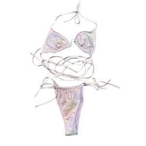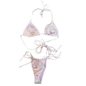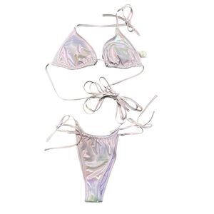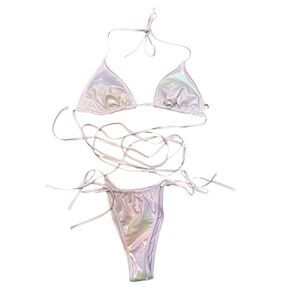 Foil triangle bikini top in iridescent lilac pearl. Strappy design with front tie. Soft, stretchy fabric Removable cups for customized coverage. Matching string bikini bottom with sanitary liner still intact. Measurements in pictures.