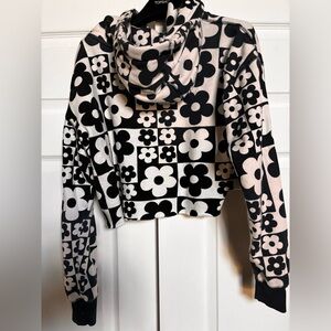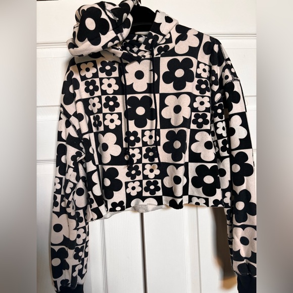 “Wild Fable Juniors/Teen cropped hoodie cropped hoodie sweatshirt with a bold black & white floral checkerboard print. Long sleeves + hood with drawstrings. Cute statement piece, easy to style for everyday casual outfits.