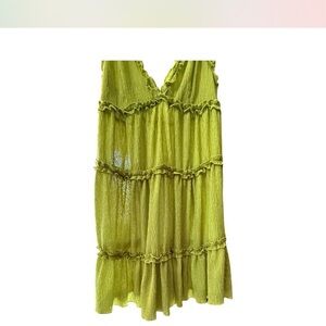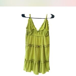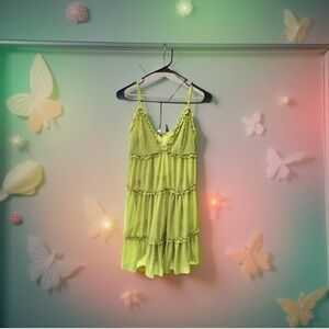 The cinched empire waistline adds a touch of princess grace, allowing the lightweight, textured fabric to drape gracefully, whispering tales of adventure with every twirl. Perfect for frolics under starlit skies or magical gatherings in hidden meadows, this dress is your invitation to live your own fairytale. #fairycore #whimsical Vibrant lime green camisole with tiered ruffles. Adds a playful touch to any outfit.