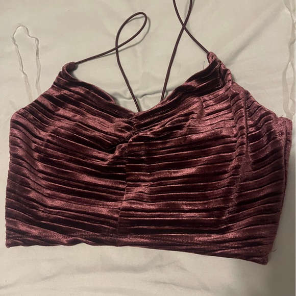Maroon velvet tank with ruched texture. Features thin straps.