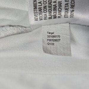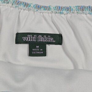 Wild Fable women's maxi halter dress in size medium with a light blue and white geometric pattern, criss-cross tie open back, and side slit. Made from soft, lightweight recycled polyester — perfect for summer, resort vacations, or Y2K-inspired festival looks. Pre-owned and in excellent condition.