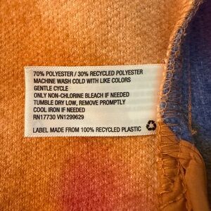 Bold jacket with a blend of orange, blue, and purple. Features a classic collar and front buttons.