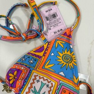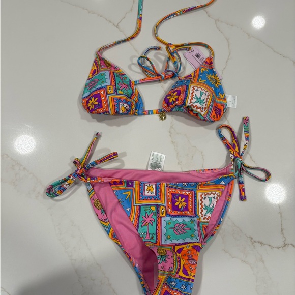 Vibrant bikini with a colorful pattern. Triangle top with adjustable straps. Matching bottoms with side ties.