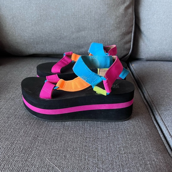 Bold platform sandals with vibrant straps. Perfect for a standout look.