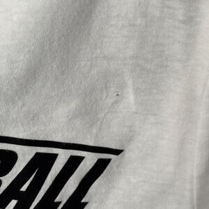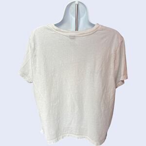 Streetwear graphic tee in white with a boxy, slightly cropped fit. Soft jersey feel. Good used condition with a tiny pinhole and faint marks shown in photos. No measurements in description.