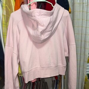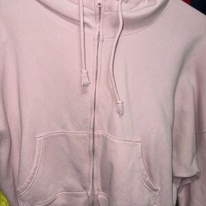 Cozy pink hoodie with zip closure. Crop length.