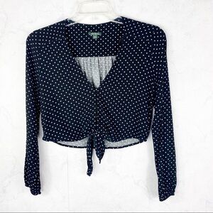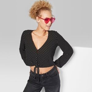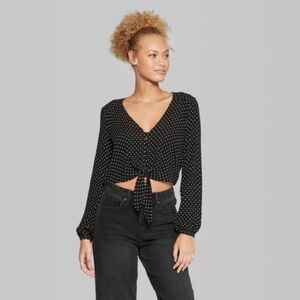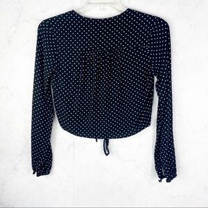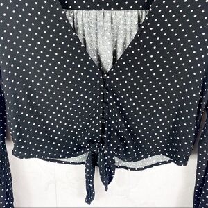 Wild Fable Classic Polka Dot / Micro Dot Tying Knot Crop Blouse Top. Long Sleeves. Button Down / Button Up Style. Button Closure. Tying Knot Details. V Neck Neckline. Black & White Color. Polka Dot Print Allover. Super Cute & Comfy. Loose & Lightweight. Great Condition. No Stains or Rips.