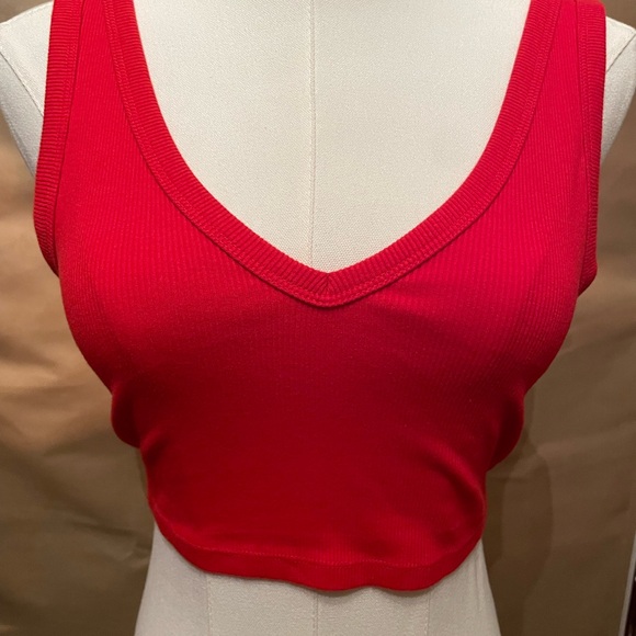 Bold red tank top with a flattering V-neck. Ribbed texture adds style.