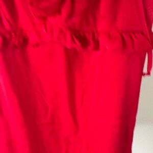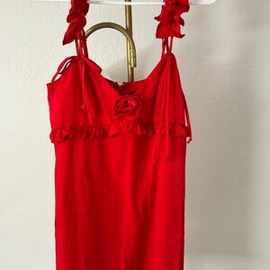 Chic red dress with ruffle details. Features adjustable straps. Perfect for a night out.