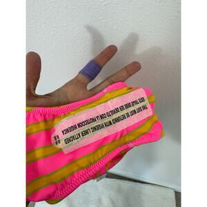 Wild Fable reversible bikini bottoms in size Large. Brand new with tags and hygienic liner attached. One side features a vibrant neon tropical floral print; the other has bold stripes in pink and yellow.