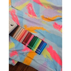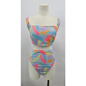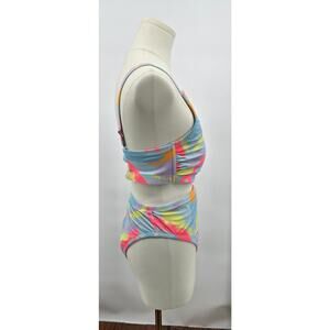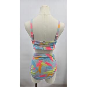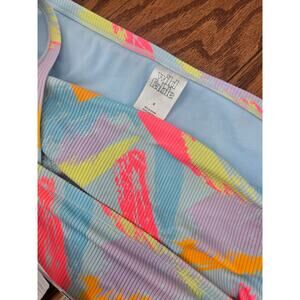 Wild Fable ribbed two-piece bikini in a colorful splash print featuring coral, yellow, lilac, aqua, and orange tones. Top includes adjustable straps and a double back clasp for a secure and flattering fit. High-waisted bottoms offer great coverage and comfort. Stretchy and supportive.