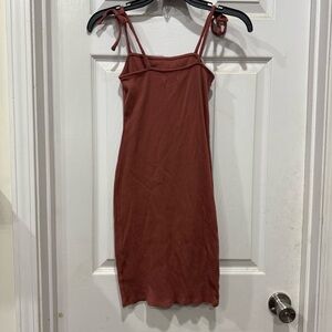 Chic rust mini dress with tie straps. Perfect for casual outings.