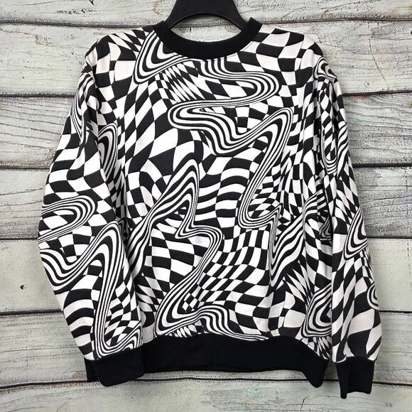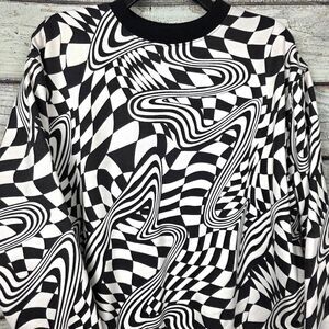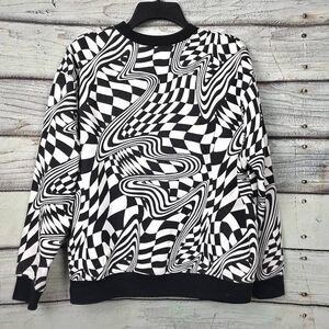 Wild Fable women’s size Small black and white psychedelic optical illusion sweatshirt. Bold warped checkerboard graphic print with ribbed collar, cuffs, and hem. Soft fleece interior. Trendy statement piece with Y2K / retro vibe.