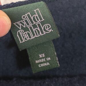 The Wild Fable ST. MORITZ Woman’s XS Off The Shoulder Cropped Sweatshirt is a stylish and comfortable addition to any woman's wardrobe. Made from a blend of polyester, cotton, and recycled cotton, this navy sweatshirt features a patch accent and a pullover closure with an off the shoulder neckline. Perfect for activewear occasions, this oversized sweatshirt is machine washable and designed for regular fit. Whether you're walking, tennis, yoga, or simply enjoying a comfortable day at home, this Wild Fable sweatshirt is a versatile and classic choice for the winter, fall, and spring seasons. I wore this sweatshirt once, and it has a SMALL barely noticeable dot stain in the front.