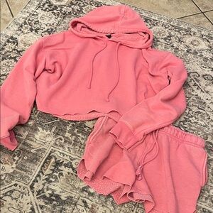 Cropped hoodie and high waisted shorts. Hoodie is a size large and shorts are a medium. Great condition! Has that faded pink look as shown in last pic.