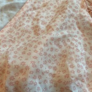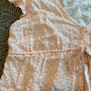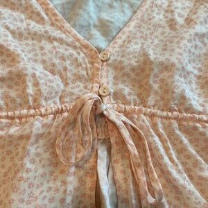 So summery! Great top for the beach or wearing on vacation. Great ruffle on the sleeves and the two buttons and tie closure in the front is very sweet. In perfect, ready to wear condition.