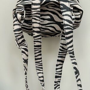 Super soft Wild Fable Black/Tan zebra Print Small Nin-Leather Backpack. Zip close small phone front pocket. Adjustable straps. So cute! Measures 10x9x4