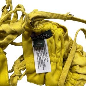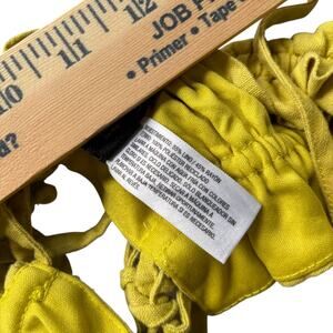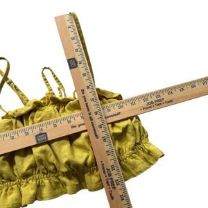 Smocked ruched crop top in bright yellow with a ruffled hem and adjustable spaghetti straps. Lightweight linen-blend shell with a smooth polyester lining — soft, breathable drape. Cute cottagecore/coquette vibe — pairs great with high-waist denim or a floaty skirt. Condition: Good.