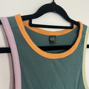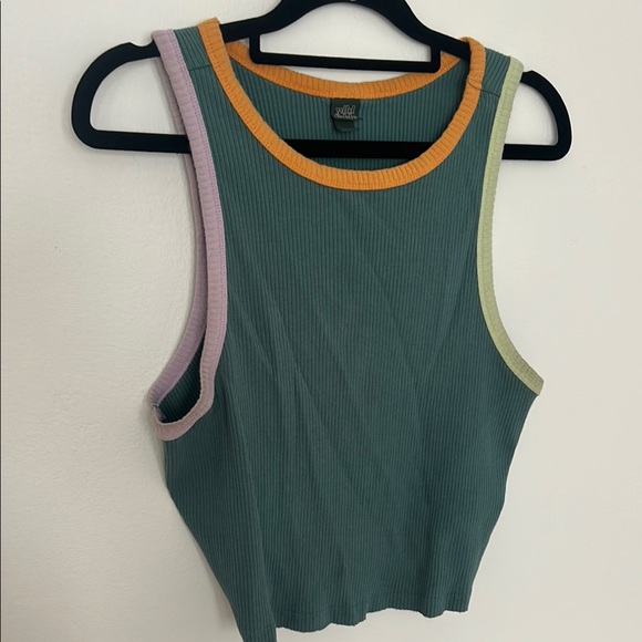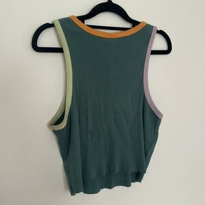 Fun top! Very comfy Small spot on the back, barely noticeable. It is pictured