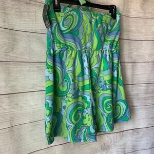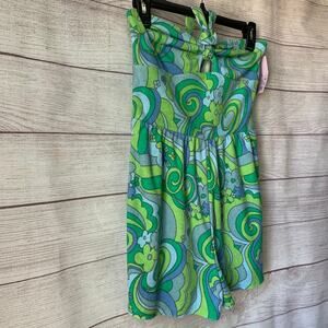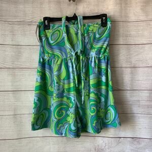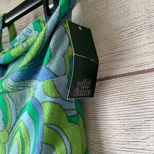 Floral and swirl romper with halter top adjustable tie by Wild Fable. This romper has shorts and a bow-shaped top with a keyhole cutout. The pattern is in blues and greens. It is a towel terry cloth type of material. It is NEW, with tags (tag bent). Size SMALL.